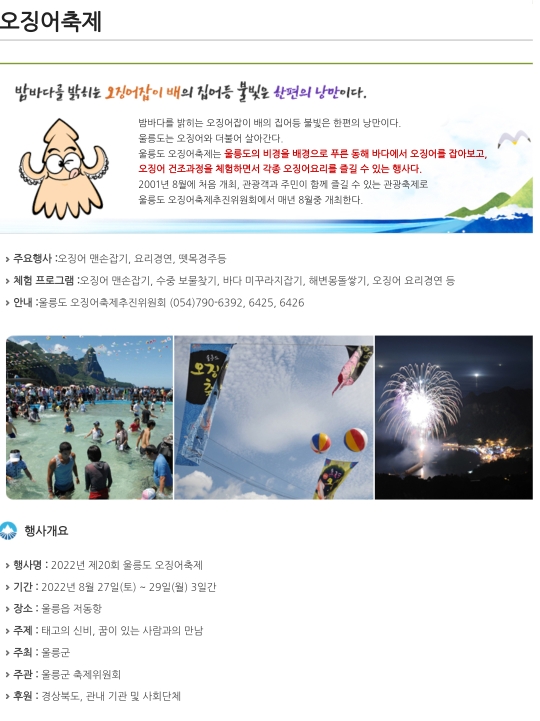 오징어축제 밤바다를 밝히는 오징어잡이 배의 집어등 불빛은 한편의 낭만이다. 울릉도는 오징어와 더불어 살아간다. 울릉도 오징어축제는 울릉도의 비경을 배경으로 푸른 동해 바다에서 오징