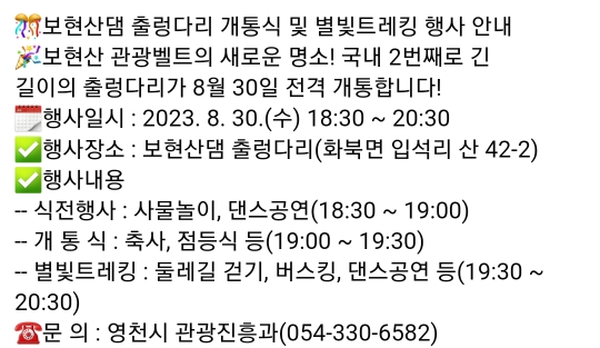 54. 영천 보현산댐 출렁다리 개통식 및 별빛트래킹(8.30)