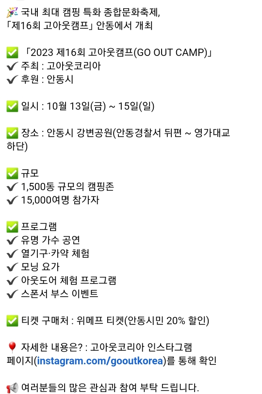 61. 안동 고아웃 캠프(10.13~10.15)유료