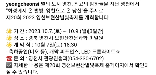 38. 영천 보현산 별빛축제(10.7~10.9)9.1~선착순 신청