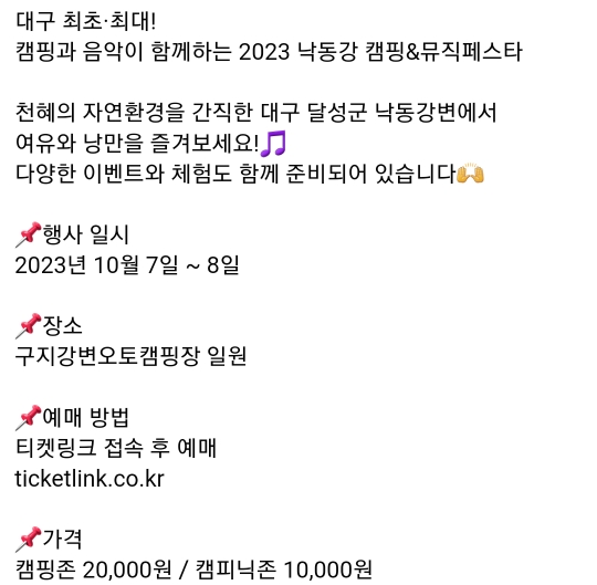 22. 대구 달성군 낙동강 캠핑&뮤직페스타(10.7~8)유료