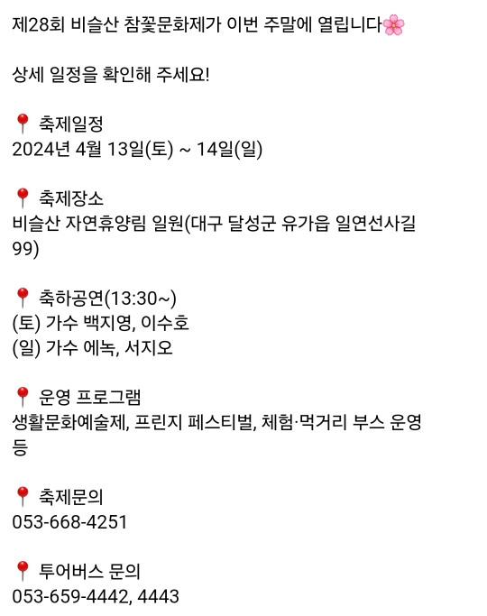 | 2024년 3월 대구, 경북 축제 (0) | 2024.02.29 |