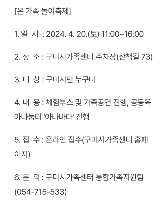20.구미 웰컴투 온 가족 놀이 축제(4.20)사전접수