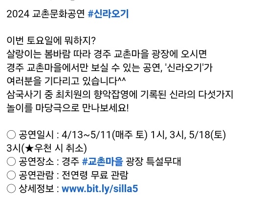 12.경주 교촌문화공연 신라오기(4.13~5.11,18)매주 토