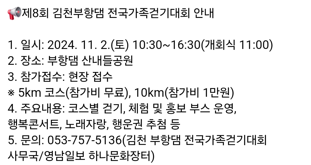 11.김천 부항댐 전국가족걷기대회(11.2)유.무료